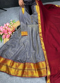 Step into the festive season with Mullai, a masterpiece of traditional design and modern luxury. Crafted for the woman who loves a touch of royalty, this Anarkali set combines the rich luster of Russian Silk with the timeless heritage of Kanjeevaram craftsmanship.