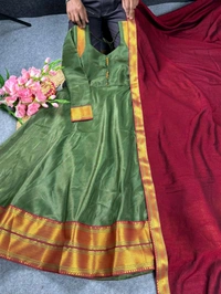 ​Step into the festive season with Mullai, a masterpiece of traditional design and modern luxury. Crafted for the woman who loves a touch of royalty, this Anarkali set combines the rich luster of Russian Silk with the timeless heritage of Kanjeevaram craftsmanship.