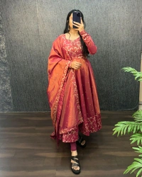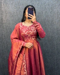 Presenting the Exclusive Gown Master Series, a premium ethnic ensemble crafted in original Banarasi Tissu silk with an elegant two-tone shade. The gown is beautifully enhanced with fine embroidery and 3 mm sequence thread work, finished with a rich Banarasi border that adds timeless festive charm.