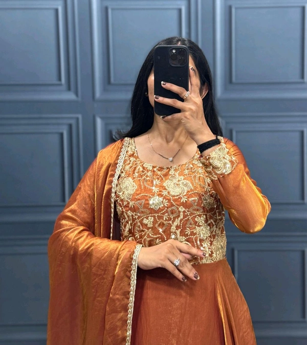 Introducing SARA, a beautifully designed Real Own Modeling Fandy Silk Gown, perfect for the upcoming festive season. Made from soft and shiny Fandy silk, this elegant gown is enhanced with attractive embroidery and sequins work, giving it a rich and graceful appearance.