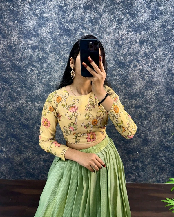 Perfect for festivals, weddings, and special occasions, this outfit combines traditional fabric with a modern crop-top style to give you a stunning ethnic look.